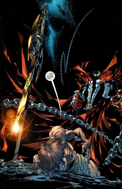 Spawn was suddenly attacked by the Redeemer. Mammon had planted the seeds to convince the Redeemer to wound him so that he would be sucked into hell by demons in a weakened state. There, Spawn battled Violator for the rule of hell.[40]