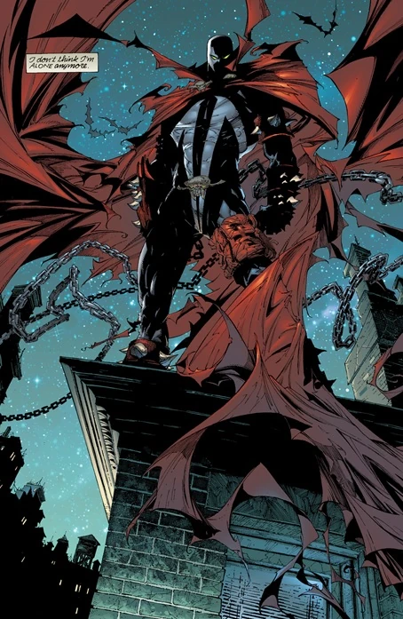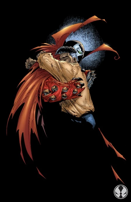 Spawn's costume evolved into a more advanced form. The formerly immaculate cape became ragged and shredded, and his costume lost its red coloring and became pure black and white. Spawn's gloves and boots also morphed, becoming heavily armored and covered with spikes. Spawn's costume was now much more powerful, and the cape and chains were capable of shapeshifting to a much greater degree.