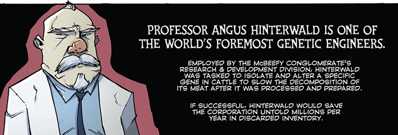 He was hired by the McBeefy's Corporation to research a gene to keep their burgers from spoiling. However, he soon discovered a way to cause a bovine explosion. This backfired in Milan where a food based fashion show was victim to an exploding beef suit.
