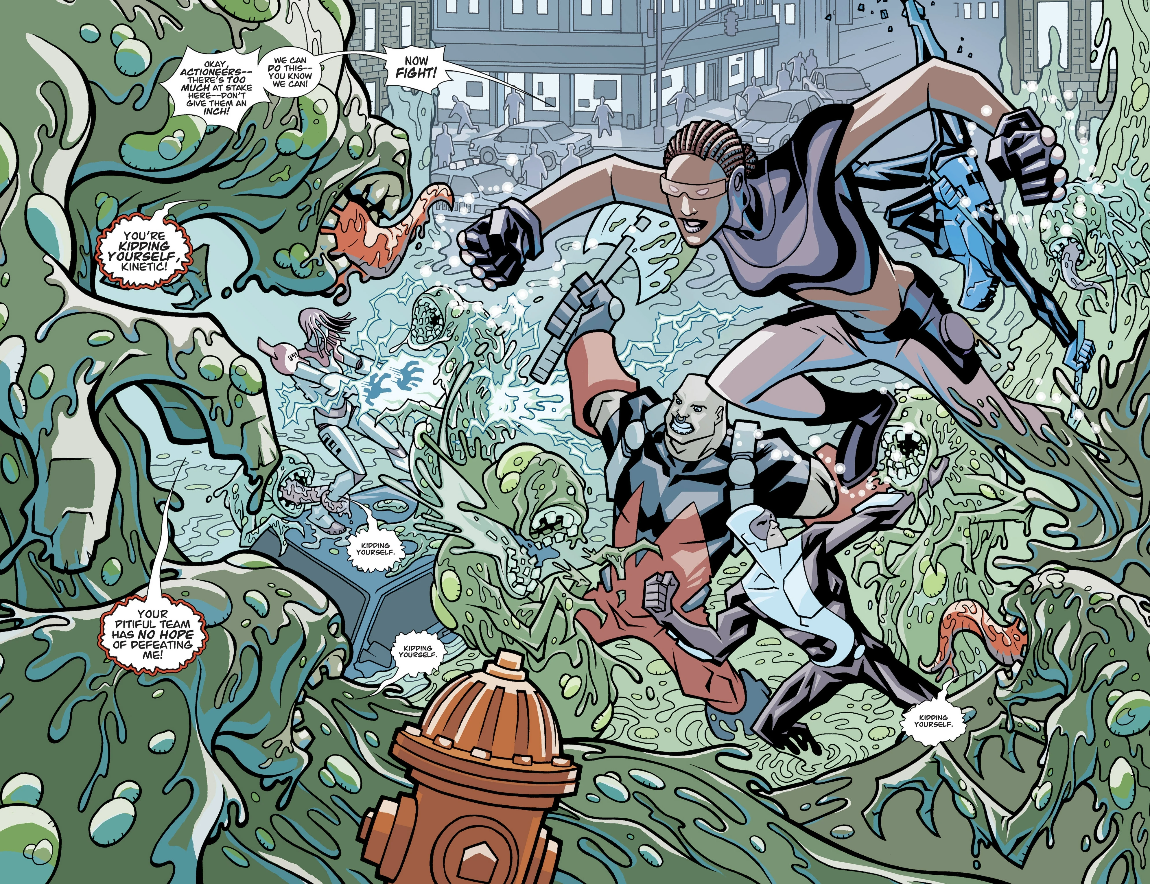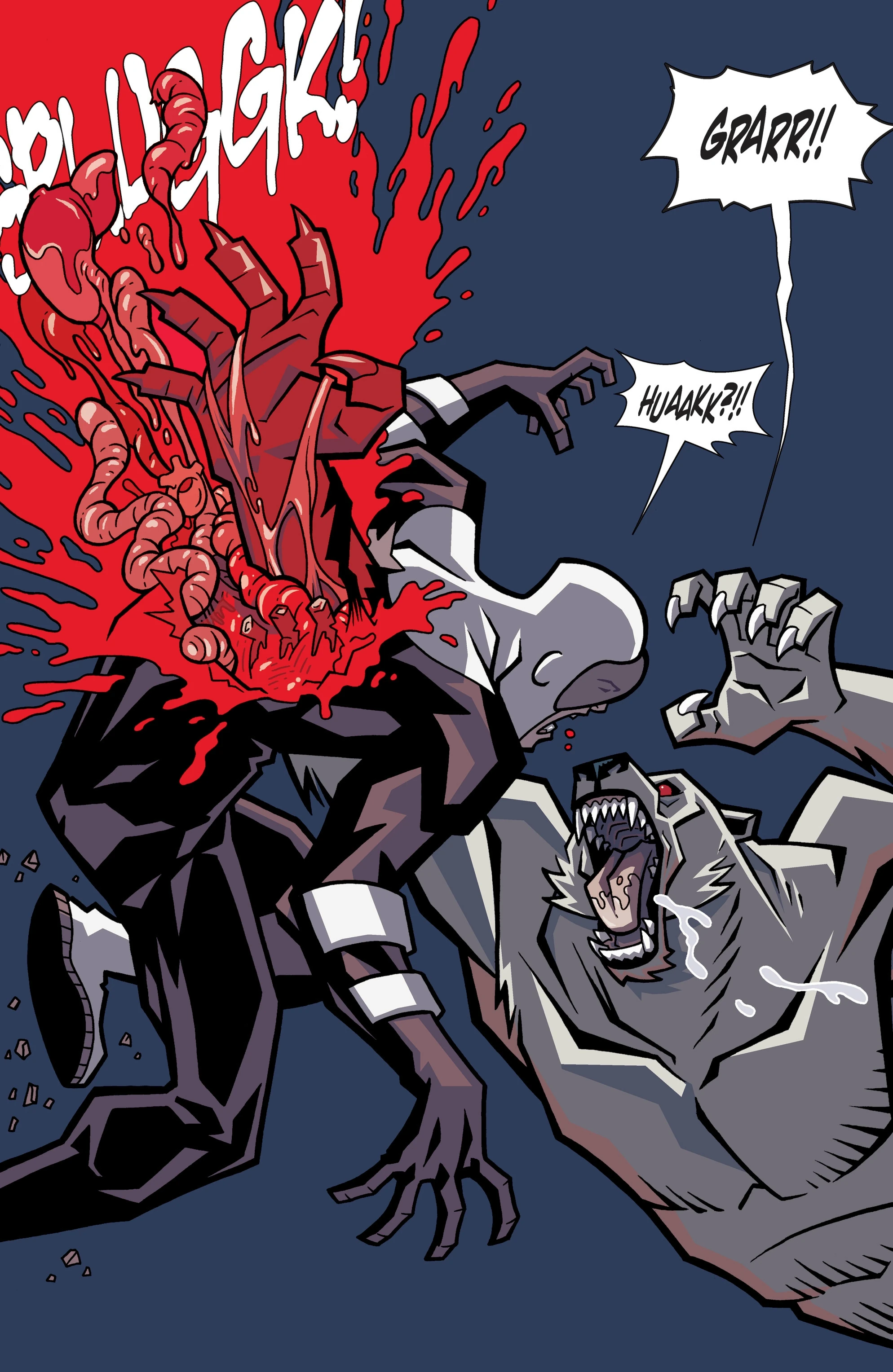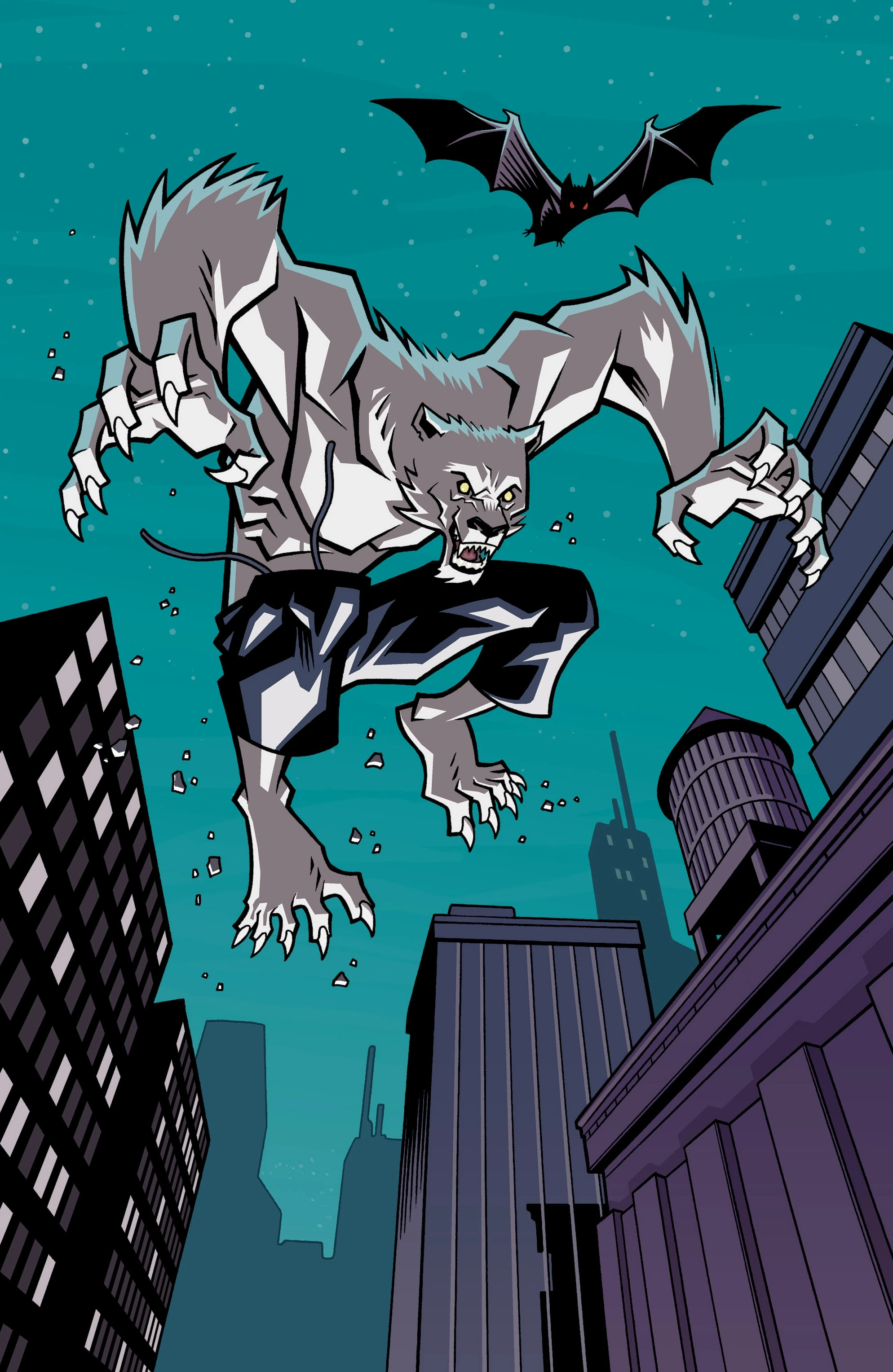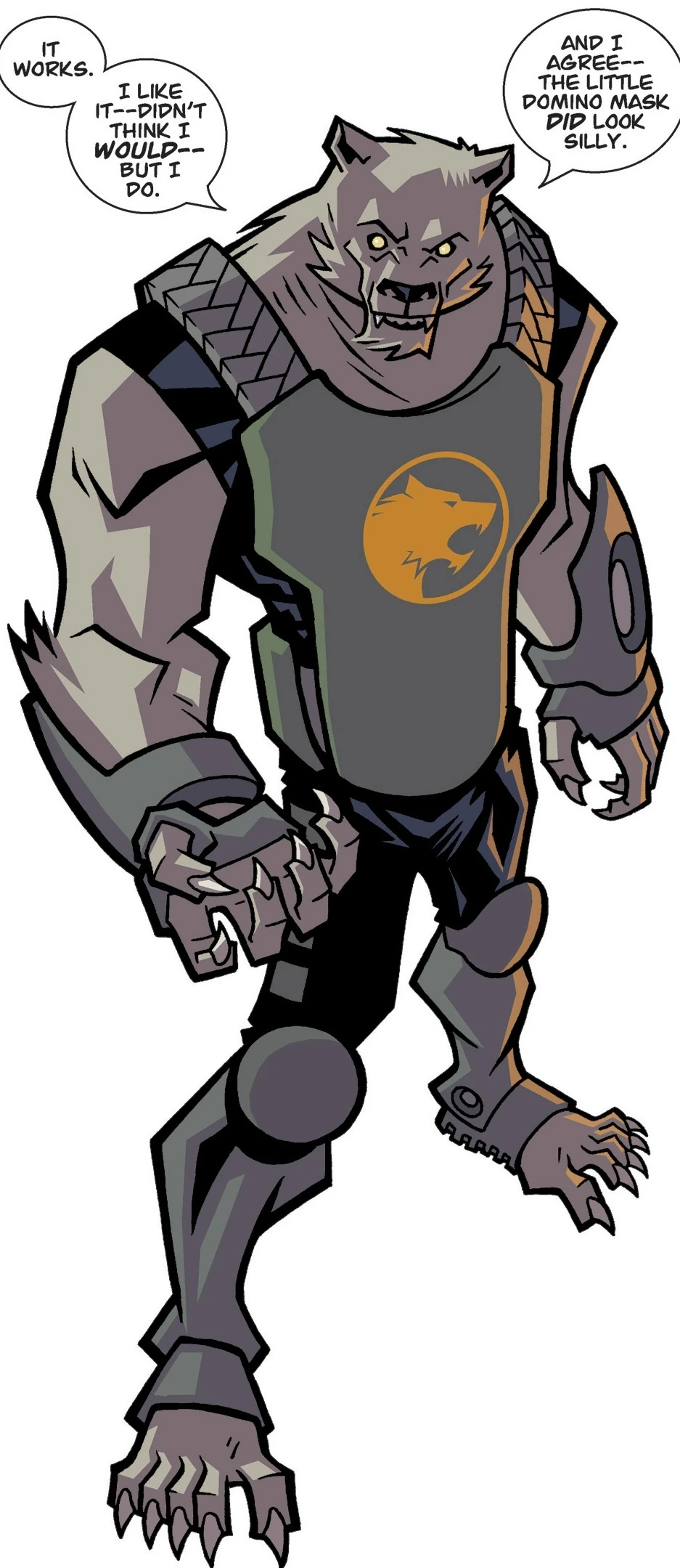 Days Later, Zechariah and Gary go to Art Rosenbaum’s shop and he is given a costume. The costume includes a bulletproof vest and spandex pants along with gauntlets. Art goes on to say that the name they called him on the news “Wolf-Man” inspired him to create the costume. This gives Gary inspiration though he initially disagreed with it. Later, Gary asks what the gauntlets are for and Zechariah reveals that they store moonlight so that he can stay outside in daylight. They are interrupted by a battle taking place between the Actioneers and Spore fighting them. Gary offers his aid to the Actioneers who introduce themselves. As Spore begins multiplying, Kinetic ask that Sergeant Superior charge into Spore. They attach to him, causing him much pain. She asks Minotaur to take care of Superior and Gary heads for Spore. A confused Mecha-Maid and Code Blue wonder who he is. Gary manages to tear him apart with ease with Kinetic in amazement. Superior grabs his head and Mecha Maid puts him in a containment pod. The five of them look around for Gary, but he had disappeared.