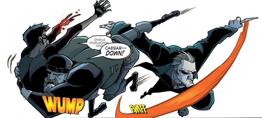 Ceasar is a skilled assassin able to throw knives with pinpoint accuracy. His missed shots on Tony Chu during his raid on the Yamapalu were on purpose to protect his fellow FDA member who did not know he was undercover. He successfully caused a citizens uprising, and raised Gallus Sapadillo plants to the ground, to support his undercover boss's frog/chicken DNA splicing efforts.[2]