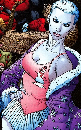 She was one of the villains invited to discuss an alliance with major post-human criminals Slaughterhouse Smith, the Daemonite Lord Defile and the Walking Ghost - a discussion which accidentally became on of the worst massacres in the history of New York City when two hapless cops stumbled on it, leaving hundreds dead. As StormWatch operatives teleported in, the Cooler maniacally engaged Fahrenheit once again. Despite being twenty stories up, the Cooler maniacally jumped from her ice ramp to wrestle with Fahrenheit and the two women crashed into the street below, with Fahrenheit taking the worst of the impact. Dazed and bleeding, Cooler was apprehended by Officer Doran. She resisted arrest, but the quick-thinking officer duped her into electrocuting herself while trying to kill him.