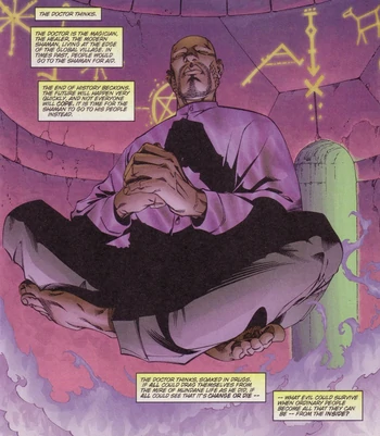 Ideally, there would be no more laws, authoritarian structures crime or war. The Doctor drugged all of London with the hallucinogen DMT. His place in The High's plan was to initiate a program of public education about the natural resources of the world, such as plants and magic, to show people a whole new world just sideways of the current one. Stormwatch attacked the group's base to stop them and the Doctor was killed by a Hammerstrike Deep Sanction Missile, a bio-war payload and tailored acid bomb. The Stormwatch field troops did not want the Doctor or his allies to die, but they had been tricked by their own leader, Henry Bendix.