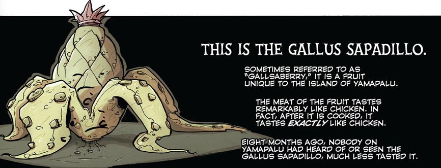 After the flu outbreak, Gallsaberry was discovered on the island Yamapalu. Nomi Huapai began abducting food critics and chefs to write about the fruit and its virtues of flavor since the FDA had banned the sale and consumption of poultry.