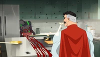 Nolan faces another monster on his way to Mark, which he tells Cecil he had defeated already. Cecil, however, told him the monster now felt no pain and was now juiced up with every drug, enhancement and upgrade available. Two news helicopters went to Omni-Man's fight.