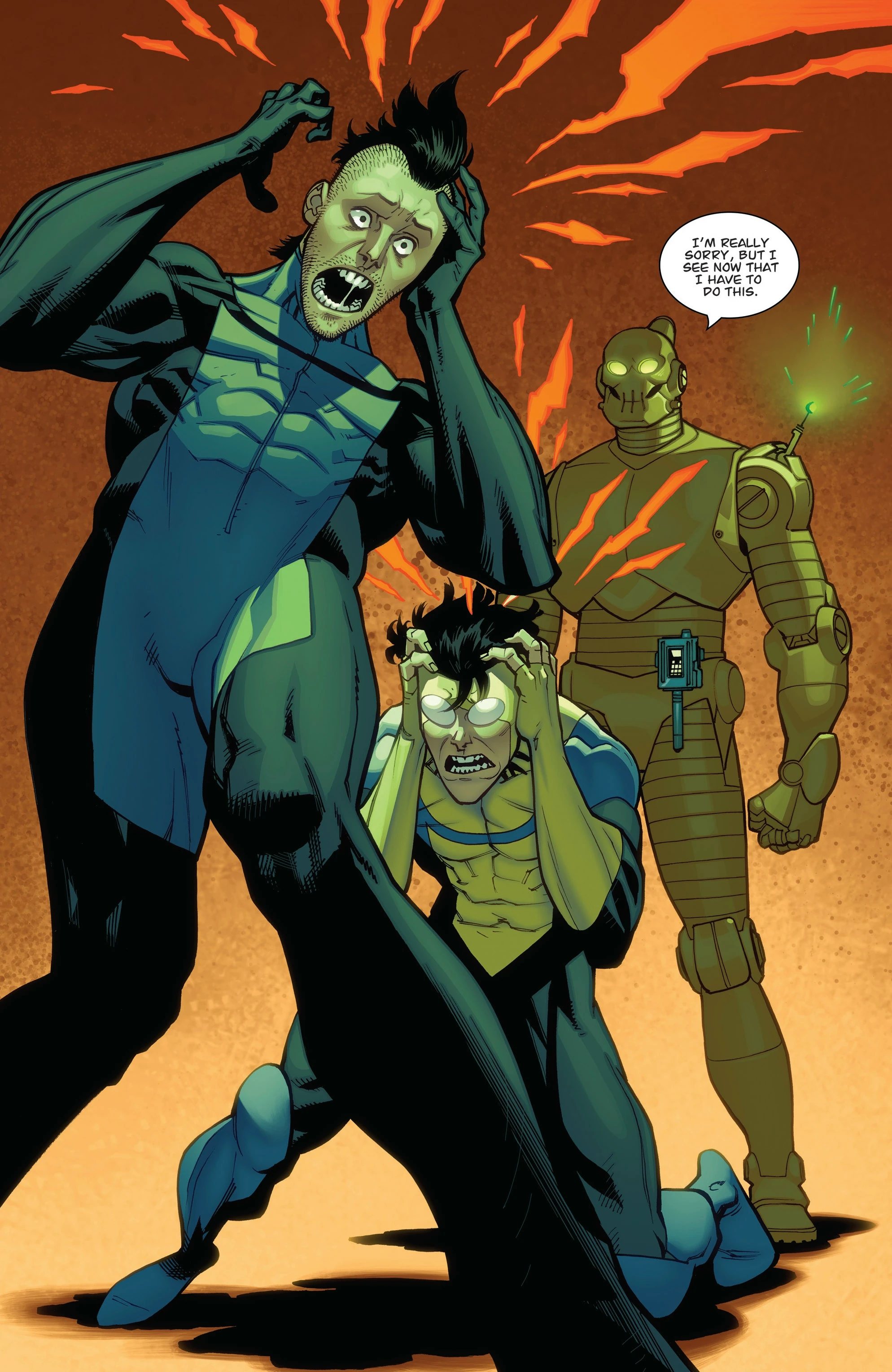 Movincihawk continues and says that before they resorted to cannibalism, they talked about how each of them turned evil. He tells Mark that he’s wasting his time saving people when they can be worshipping him. Robot transmits a low sonic pulse to take advantage of the Viltrumite’s vulnerable ears and apologizes.