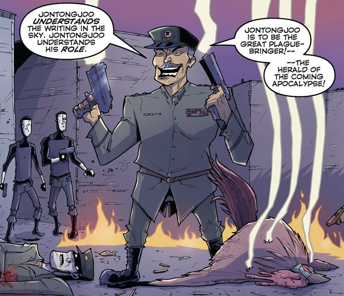JonTongJoo was the leader of North Korea. He began research on a synthetic avian flu bio-weapon. He completed it on task and at a rapid pace. This caught the attention of the NASA who sent in agents to stop the leader. He was ultimately murdered in the assault by Poyo when agents released him as a last-ditch effort.[1]