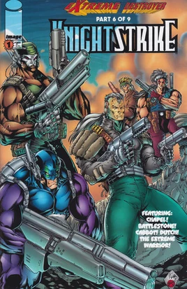 Dutch and Marla Thomas arrive at the crashed Keep ship in Peru. When Colonel Bravo and Link materialize in a burst of energy, Marla shoots at them. Link destroys her gun, and Dutch talks with Bravo. Then, Battlestone arrives with Bloodstrike, Chapel, and Extreme Warrior. Elsewhere, Maximage lets the Ancient and New Man know that Dutch has made contact as intended. At the Pentagon, Alan Keever and Sentinel chastise Supreme for not going with Youngblood to fight the Keep. An explosion rocks the building as hundreds of Keep soldiers mass outside. Supreme and Vanguard fly off to face them. Back in Peru, Battlestone explains the crashed ship is a Keep slave craft used in “the Harvest.” He and Dutch snipe at each other until they come to blows, but the others stop their fight. Suddenly, the ship’s systems come back online, and it takes off to rendezvous with the Keep mother ship. Back on Earth, Dusk and Narcisse see Supreme battling the Keep ships overhead. They hear someone groan behind them and are surprised when they see who it is. Aboard a Keep slave ship, Dash shocks her fellow New Men by saying they should go along with the Keep. Then, Black Jack appears and teleports her away. Upon docking with the main Keep ship, the informally re-formed Knightstrike and their allies begin slaughtering Keep troops. Maximage telepathically tells them to find and free a special prisoner. Battlestone orders them to split up and free every prisoner aboard. Marla goes with him intent on killing him in revenge for husband’s death. Supreme bursts in, causing a hull breach, and Stone saves Marla from being sucked out into space. Someone abruptly seals the breach, and when Stone asks who, his father Quantum announces himself.
