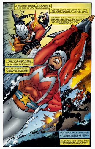 Missile Man accidentally discovered his powers while he was trying to jump a train. He immediately decided to use his new powers for good. The day after the attack on Pearl Harbor, he joined the metahuman effort in World War II against the Nazis, clashing against the Black Panzer, among others. On V-E Day, he and other superheroes of his time received medals, but he was not sent to Japan along with other heroes of the time.