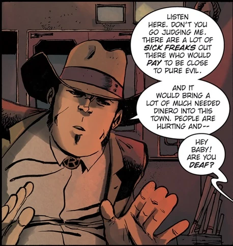 Raleigh Woods is the store owner of the Murder Store which is dedicated to the sixteen serial murderers of Buckaroo. Woods' grandfather was the Book Burner and he does not see an issue on profiting on their misery or story.[1]