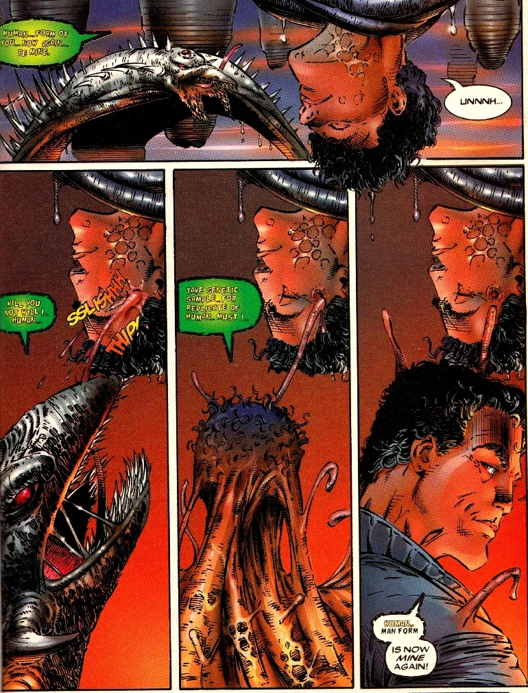 Sh'rrrnn's next guise was as a station hand named Dennis[10] who witnessed the arrival of Stormwatch Team Five (a cover for Morgan Stryker and his Strykeforce team as Stryker was friends with Weatherman One and agreed to help him). Dennis suffered a sudden spasm and avoided further contact with his friend and co-worker and fled into a hallway. Sh'rrrnn had neglected to "renew" her guise and desperately fled to her lair. Once there, it was revealed she held numerous crew members, immobilized and unconscious. Here, Dennis was suspended upside down and immobilized where Sh'rrrnn extracted a blood sample through her tongue.