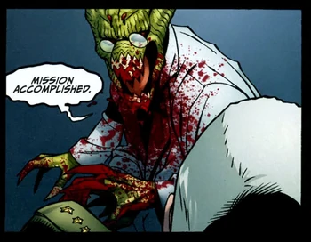 Sixty-three years later, when the NOTB program was compromised by The High, Slyxx was summoned to Washington, D.C.'s Pentagon by General William Somerset, the current overseer of the program, as to why the reversed-engineered alien technology didn't prevented the contained metahumans from acknowledging their virtual reality imprisonment. Slyxx explained that the technology was not meant to be used as a "prison" and that the number of 'subjects' caused the program's compromise. After Somerset had launched the weaponized clones of The High known as the Reapers and were driven insane from their original programming, Slyxx explained to The High, who arrived to the Pentagon to stop his clones, that the Reapers were fully intended to destroy the world's metahumans by creating a post-apocalyptic cataclysm. After The High left to stop the Reapers, Slyxx killed all of Somerset's staff and used the Pentagon's computers, stating to a surprised Somerset that he had left a message to the Daemonite command-creche with the words, "mission accomplished." Slyxx's message definitely stated that the Daemonites had planned Earth's cataclysm from the very beginning of the NOTB program.[1]