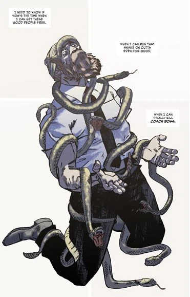 Boone marches back to the church. He walks directly to the serpents and covers his body in them to find they won't bite him. He knows he's completing God's work with the confidence that his serpents won't harm him. He begins to think about his next task, killing Coach Boss.