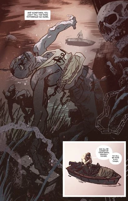 The next morning, Boone takes a boat out on the water. He runs into a boat of Running Rebs. The boy attempts to strong arm him into helping him steal guns from an incoming "big shipment". Boone tells him to keep moving and he won't help him. As they take off, he throws a cinder block into the river with Arley's body tied to it. It sinks to the bottom where several other bodies float with the same fate.