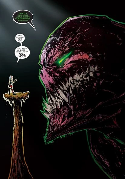 Satan's demon is impressed that Spawn refused to alter time as he understood the impacts it would have on the future.[1] She offers him a deal. She tells him she'll return Wanda Blake to him, unharmed and without strings to be his wife once more if he agrees to give them his Symbiote Suit and agrees never to step foot into Hell again. Albert wraps his suit around her and transports her to the Dead Zone. He tells her he does his best thinking here. He uses the nullifying effects of the dead zone to then slash her arm off and hold her against the wall by her throat. He uses his suit to slash her face and forces her to show her true form as a demon. He tells her that she has it wrong. He'll come to Satan when he's ready, and it's Satan that should be hiding.