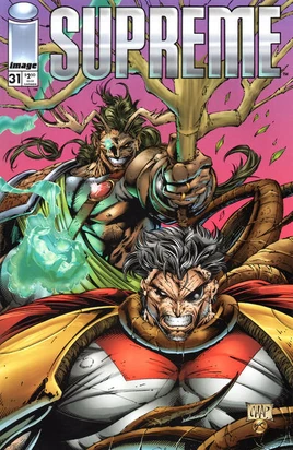 Supreme destroys the last of Darkthornn’s Disciples still wreaking havoc on Earth, but his eye is injured in the process. As he flies off, Dexter Cortex appears to him via hologram and offers to treat his injury. Supreme flies to Cor-Tek where Cortex operates on it. After Supreme gives thanks and leaves, Cortex reveals to his assistant that the man who just left is not the real Supreme. The next day, Charles Flanders takes Supreme up to his cabin in the Allegheny Mountains for a vacation. That night, Supreme is sitting outside by the fire when Glory arrives and makes out with him. Inside, Flanders finds Maxine Winslow’s biography of Supreme online. He runs out to tell Supreme but finds him kissing an animalistic woman. Believing her dangerous, Flanders shoots her with a shotgun. Suddenly, tree branches come out of the ground and attack him and Supreme. A man named Equinox appears seeking revenge for the woman, his daughter. After a brief battle, Supreme deduces Equinox’s power lies in his staff and threatens to break it. The woman, named Roe, cries out for them to stop and explains destroying the staff would destroy everything for miles. She reveals that she and Equinox are the last of their extradimensional race, she sensed Supreme’s loneliness, and she was overcome with desire for him. She invites Supreme to come with her and Equinox, but he reluctantly declines, and they leave.
