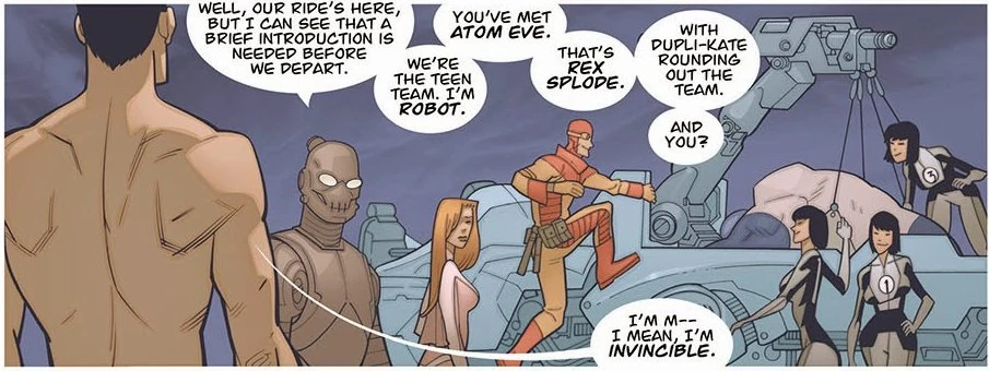 The original members were Atom Eve, Rex Splode, Dupli-Kate, and their leader Robot. While fighting the super-villains known as the Mauler Twins, they met another teenage superhero named Invincible. Although he never joined them, he remained a loyal ally.[1]
