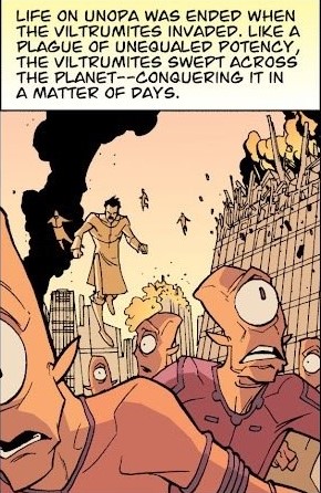 The Unopans are habitants of the planet, Unopa. They encountered the Viltrumites long ago, but resisted them from taking over their planet. Their efforts of resistance caused the near extinction of their people in a global genocide led by Nolan.[1] Many Unopans would escape the planet and become a nomadic species. In order to ensure their survival, they would establish breeding camps to populate to the point where sex would be forbidden among them. They would later join the Coalition of Planets in an effort to combat the Viltrumites.[2]